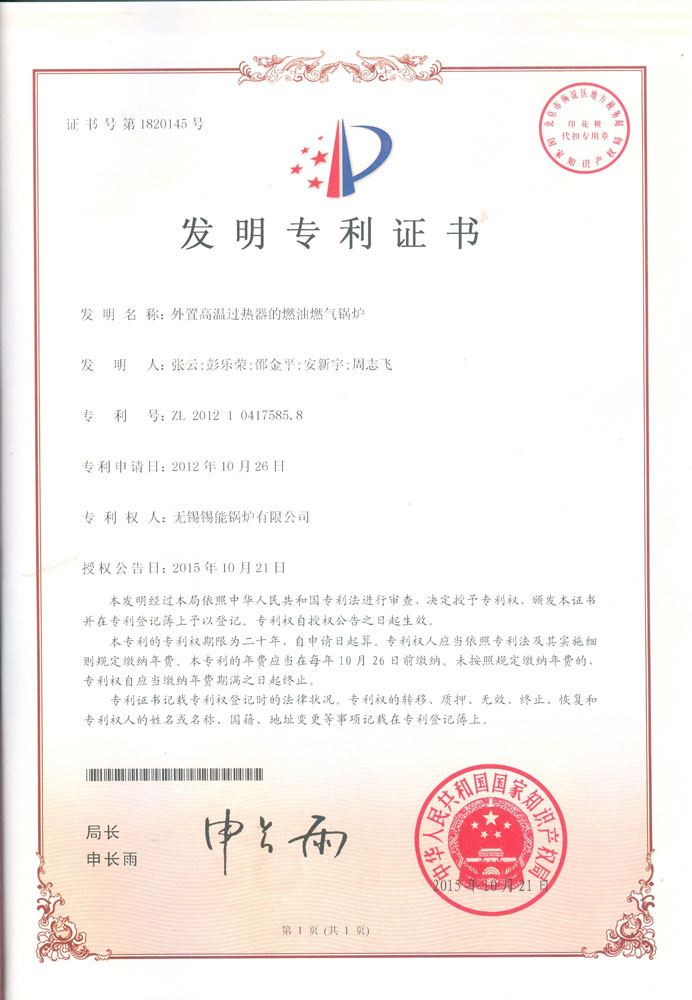 • 發明專利201210417585.8外置高溫過熱器的燃油氣鍋爐