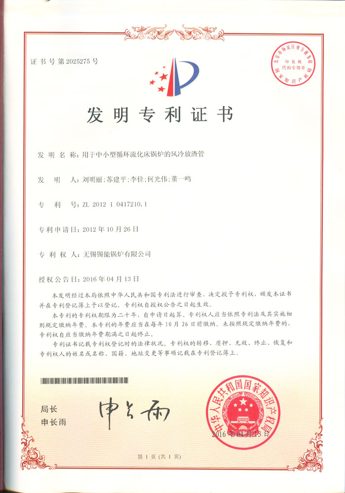 • 發明專利201210417210.1用于中小型循環流化床鍋爐的風冷放渣管