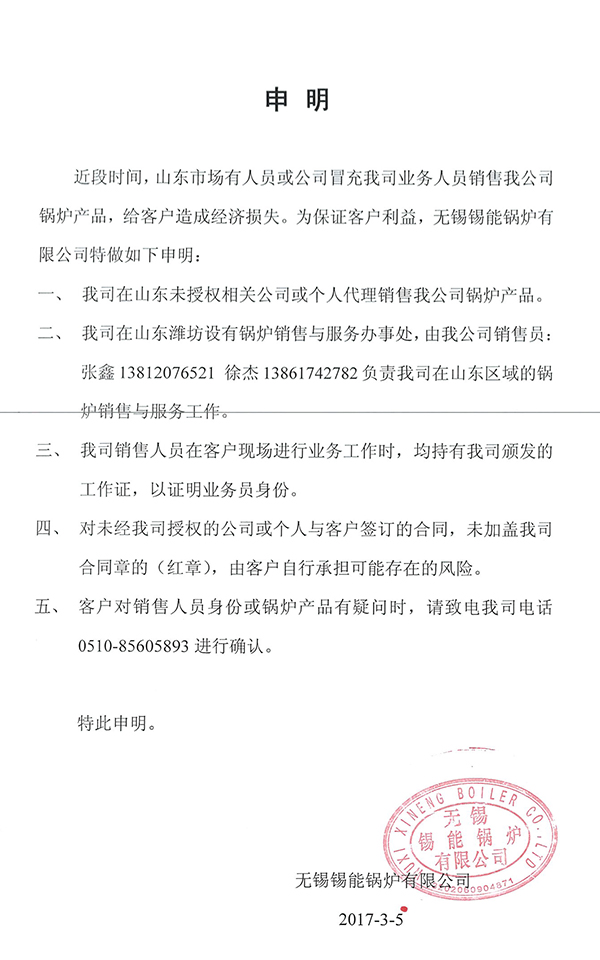 近段時間,山東市場有人員或公司冒充我司業務人員銷售我公司鍋爐產品,給客戶造成經濟損失。為客戶利益,無錫錫能鍋爐有限公司特做如下申明: